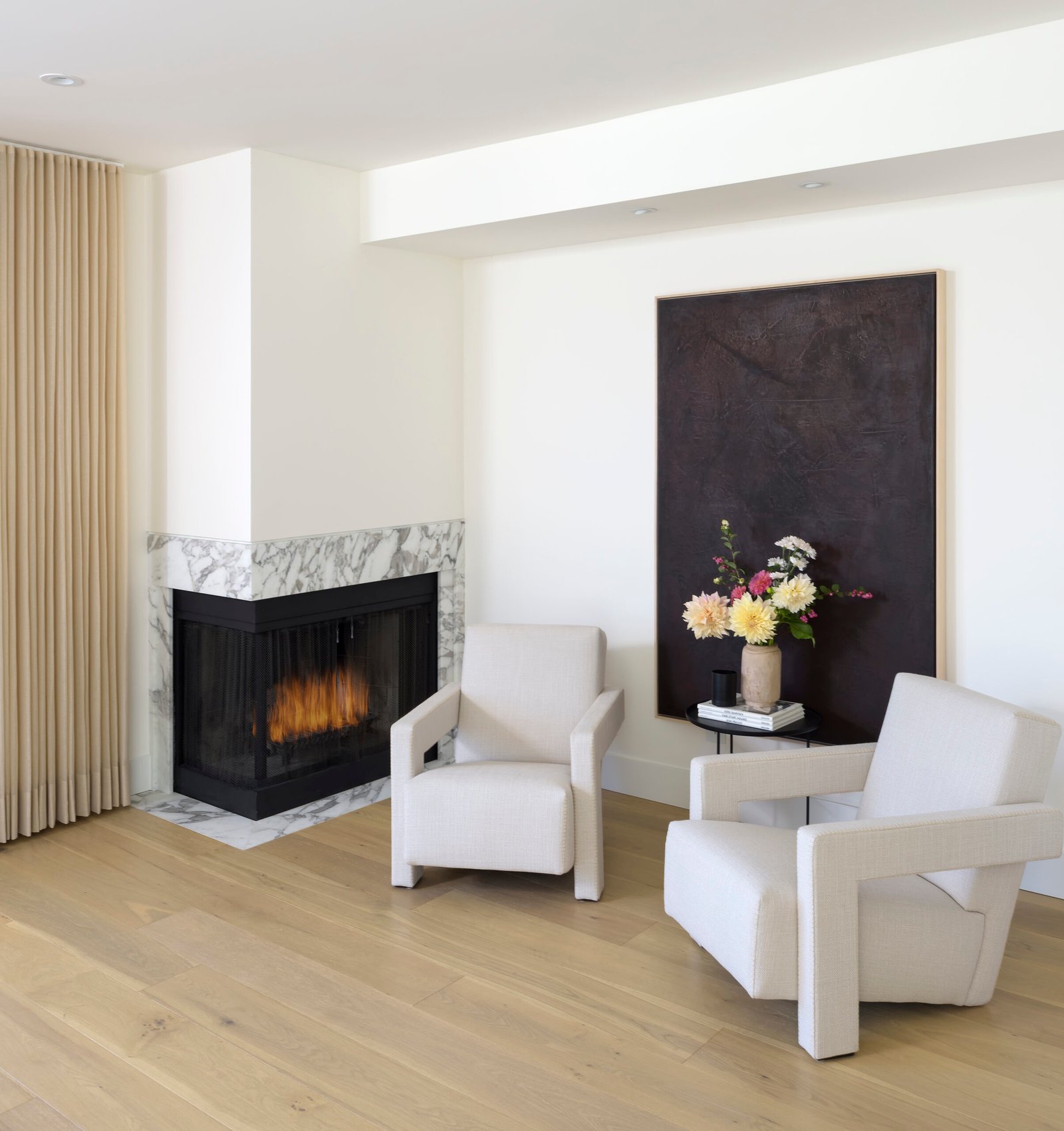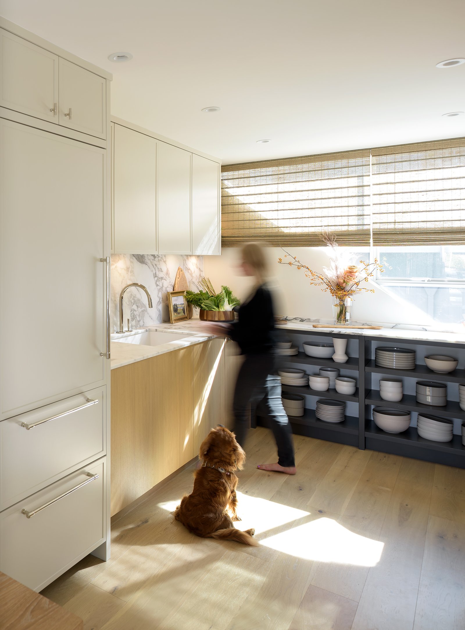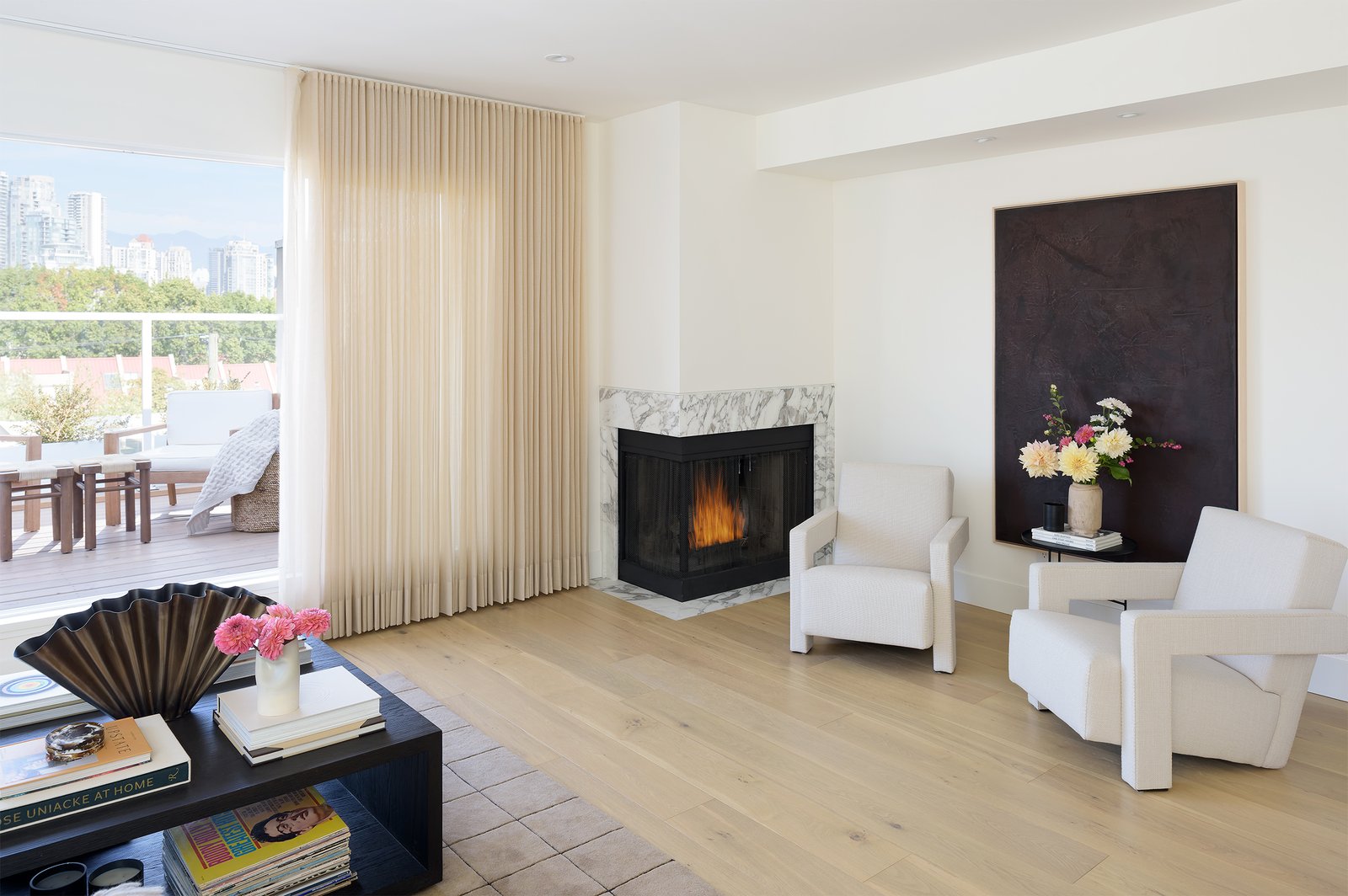 The design team at Jamie Banfield Design took this project to the next level by opening up walls between the living and kitchen areas, re-vamping the entire kitchen layout, and re-drawing the principal bedroom layout with an ensuite, while taking advantage of the skylights and ample natural light. A heat pump was added on the roof to provide air-conditioning and heat while the existing wood-burning fireplace was revived for décor.